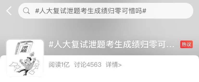 考研初试总分415分,复试0分?这几天,“人民大学法学院考研复试泄题”在网上流传。相关网帖描述,在今年人大法硕复试当天,复试早的考生在群内分享了复试题目,被群内其他考生截图举报后,学校决定对分享复试题目的考生全部记0分。人大有关工作人员回应,确实有多位考生复试成绩为0分,但是否因“复试泄题”所致,暂无进一步回应。考试结束后分享题目、讨论解答,在很多人的学习经历中都存在。如果是统一时间、统一地点的考试,考试一结束,考试内容便可公开,考生之间互相讨论无伤大雅。问题在于,在考研复试中,每个考生面试的时间不同。如果先考完的考生向还未参加面试的考生透露考试情况,确实有机会让后者临场准备,揣摩命题思路,人为造成考试不公平。
