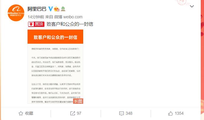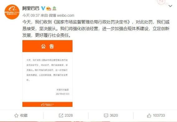 4月10日,@阿里巴巴 发文回应被处罚182.28亿元:我们收到《国家市场监督管理总局行政处罚决定书》,对此处罚,我们诚恳接受,坚决服从。我们将强化依法经营,进一步加强合规体系建设,立足创新发展,更好履行社会责任。
