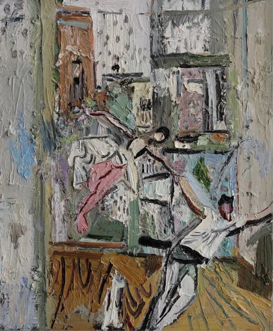 【编者按】在一个艳阳天的春日,来到闫平老师的画室。窗外的梨花、桃花在热闹的怒放,光线变幻中,暖调的粉色,冷灰的嫩绿与画架上一幅尚未完成的油画相互应和着,但画上的“景色”远比春光里的姹紫嫣红来的更动人心魄。其间冷暖色块的交融碰撞,线条在轻重缓急,启承转和间的书写,既是个人的日常,又是与大时代一起搏动的史诗。大概“万簇生成”的四月里总是要诞生一些不平凡的故事吧。