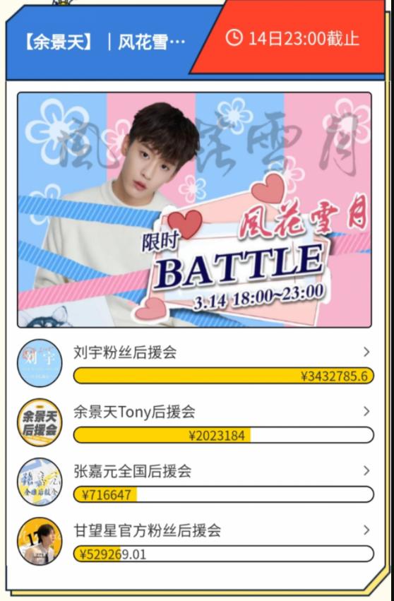 3月14日,刘宇和《青春有你3》选手余景天battle集资。