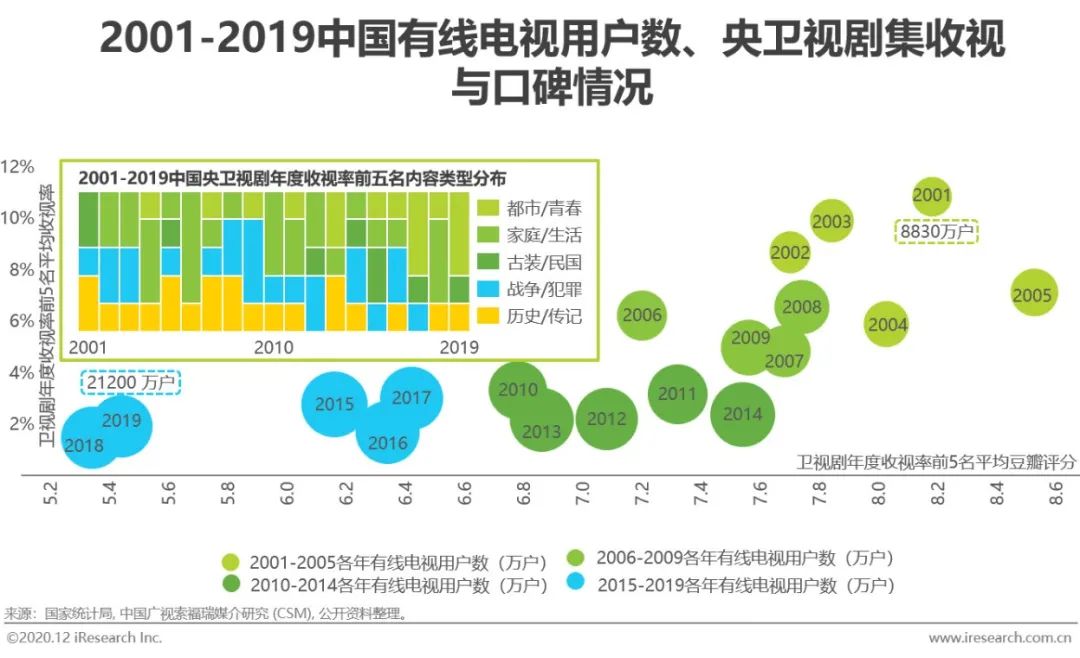 近20年来,以电视为代表的传统主流渠道的受众不断拓宽,从2001年的0.88亿户提升至2019年的2.12亿户,但同时整体收视水平及其集中度,以及热门内容的大众口碑呈下降趋势。一方面,传统广播电视渠道无法彻底突破内容传播上时间与空间的局限,因此广告始终是其最为主要的变现模式,于是传统广电渠道播出的内容在除承担起传播主流意识形态的使命之外,须尽可能地契合到更多人的兴趣,这一点亦可从2001-2019各年度收视前5的剧集题材类型佐证。另一方面,用户群体的泛化所带来的兴趣分化,以及内容供给的逐渐繁荣,使得绝对的主流群体与绝对的大众内容概念在当下环境中逐渐淡化,大一统的大众内容时代逐渐黯淡,但广大人民对于电视场景的需求仍然存在,传统渠道亟待模式与逻辑的转型。