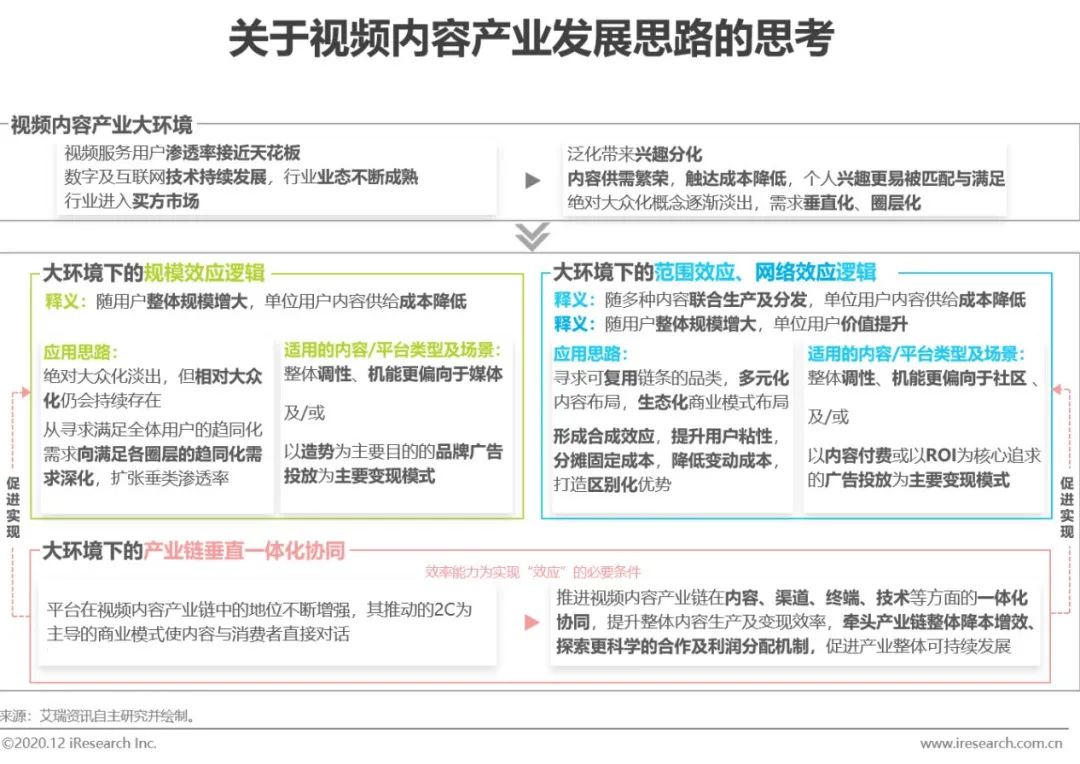 在基于互联网流量红利的规模效应逐渐见顶,并且用户兴趣随群体泛化而分化的大背景下,向范围效应、网络效应过度,形成板块协同,高效发挥内容价值、谋求价值增量,赋能并带动实体产业的发展,效率与体系将是寡头竞争格局中的重点。