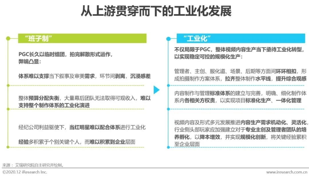 长期以来,我国视频内容生产处于非标准化的“班子制”状态,生产管理整体可控性薄弱,各细分方权责不明确,整体预算分配失衡,环节间剥离,经验的积累也难以留存到企业层面。长视频内容成本高企,内容变现因产业的非标而可控性与效率低下,而随着视频内容的多元化、垂直化发展,新的品类与形式对内容的工业化的生产也提出了需求与要求。这些于数字及互联网时代新崛起的规模化品类,也因其“新”而受老体系的制约较小,更易于探索与开拓支持工业化生产体系的方面间合作模式,从而牵引整个视频内容产业的短板补齐,提升企业经营效率,向标准化生产、一体化管理演进。