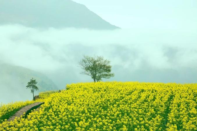 阳春三月,正是油菜花开放的季节,梯田之上,是油菜花开成的大海,微风一吹,卷起一阵阵明黄的波浪,又因高低不同,层次分明,竟有种“裸眼3D”的效果。