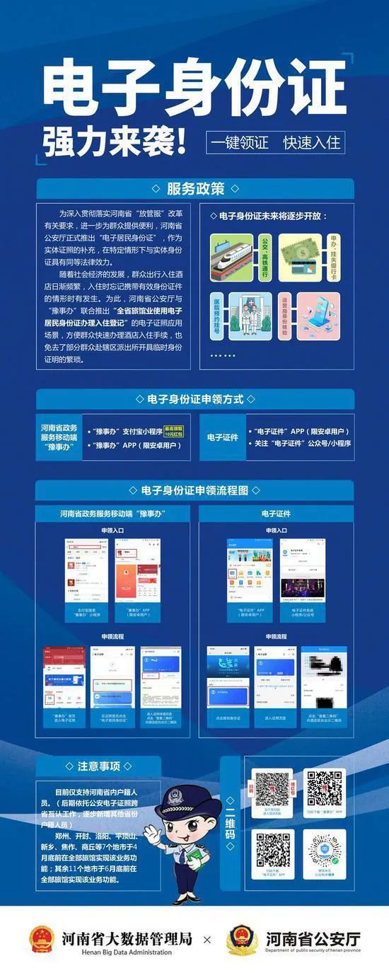 同时,图片中显示,河南电子身份证由河南省公安厅推出,作为实体证照的补充,在特定情形下与实体身份证具有同等法律效力。而且,为方便群众快速办理酒店入住手续,省公安厅与“豫事办”联合推出“全省旅馆业使用电子居民身份证办理入住登记”的电子证照应用场景。不过,需要注意的是,电子身份证目前仅支持河南省内户籍人员。