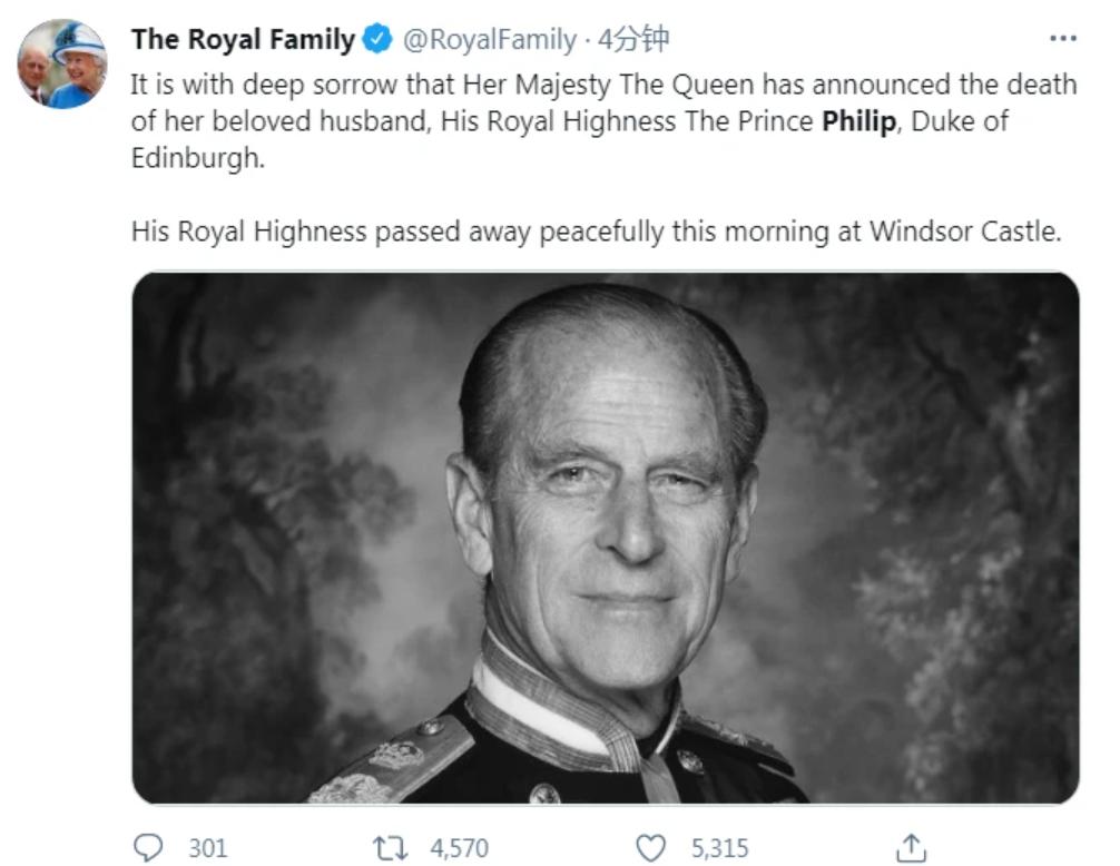 2021年,4月9日,英国女王的丈夫菲利普亲王去世,享年99岁。
