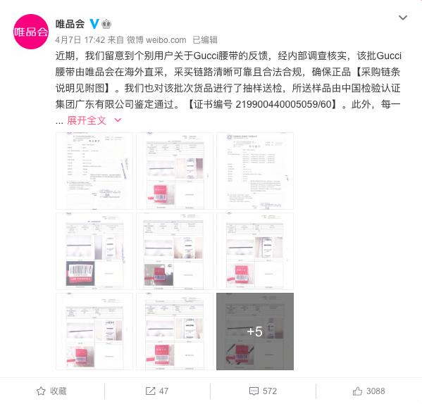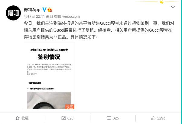 唯品会官方微博回应说明截图。随后,得物也在官方微博发表声明:对相关用户提供的Gucci腰带进行了复核。经核查,相关用户所提供的Gucci腰带在得物鉴别结果为非正品。并称将该腰带送至四家第三方鉴定平台检测,鉴定结果都是未通过。