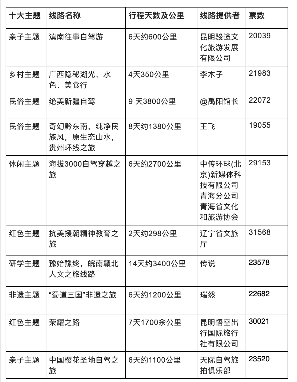 从线路征集到全网票选的2个月里,在腾讯新闻、百度APP、百度好看视频、聚看点、爱卡汽车、走吧网,平台共同征集发布主题线路,第一季度共征集自驾游十大主题10.1万条主题线路,其中新能源主题:15746;康养主题:15634条;民俗主题1599条;毕业主题9637条;乡村主题10631条;研学主题16060条;非遗主题6752条;休闲主题:16320条;红色主题:8801条;亲子主题15910条,参与人数55万人次。在此非常感谢参与参与征集活动的用户和专家评委以及许许多多支持本次活动的朋友们!