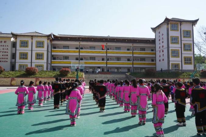 早上十点左右,全校500余名学生齐聚运动场,同学们身着彝族服装,在春日的暖阳下,整齐划一,迈开步子,在充满节奏的民族音乐《阿西里西》中,跳起融合少数民族特色的课间操,脸上洋溢着欢快的笑容。“课间操总共分为七个环节,第一个是国旗国徽至尊至上;第二个是大合唱,主要唱我们的民族乐曲《迎客歌》;第三是武术健身操,提升同学体质;第四是童心舞动;第五是分组舞蹈,同学们分为撮泰吉、衣角舞、撒麻舞、月琴舞、七月火把节等小组进行舞蹈表演;第六是学生宣誓,好好学习,热爱祖国;第七是铃铛舞,大家一起跳铃铛舞。”板底小学负责民族文化教育的罗钰老师介绍道。