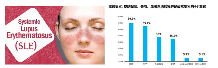 SLE是一类高度异质性疾病,每个患者的表现都不一样,轻者只是皮肤关节的病变,重者会有血液系统损害以及肾脏、心脏、肺脏等重要脏器的损害,甚至会累及中枢神经系统,出现神经精神狼疮。然而容易被误导的是,虽然SLE最典型且最为人所知的症状为面部蝶形红斑,但其首发症状以骨骼肌肉痛(70%-80%)最常见!