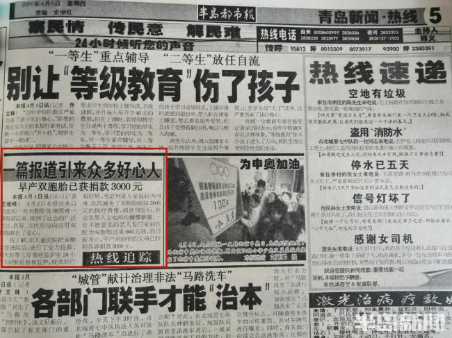 半岛记者王维峰王维峰回忆说,2001年刚进入报社不久,还是一名普通的见习记者。当年3月底,一位爱心市民拨打了半岛都市报热线电话求助,称一对双胞胎姐妹早产,每天的监护费就300多元,孩子的父母借遍了亲戚朋友还是不够。