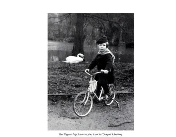 汤米·温格尔童年照温格尔1931年出生在法德边界,三岁半父亲去世。二战爆发,还是个孩子的汤米·温格尔开始创作战争漫画。纳粹统治给他的童年带来终生难以消解的创伤。温格尔被战争中的血腥残酷折磨,也因目睹战后法国焚烧德国著作而幻灭:“他们把歌德和席勒的书丢进焚烧炉,这和纳粹有何不同?”