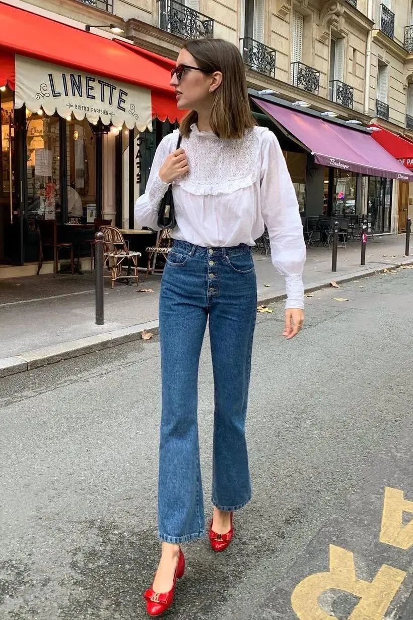 当宫廷风花边衬衫遇上喇叭裤,一身穿搭复古气质十足,还带着法式浪漫气息。