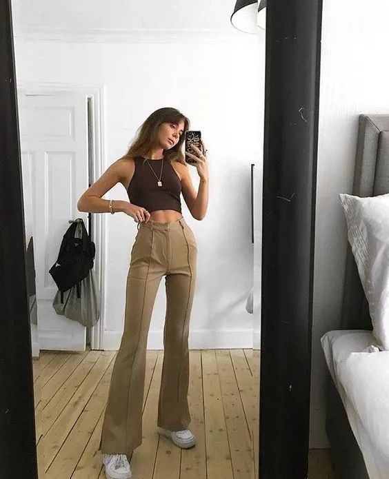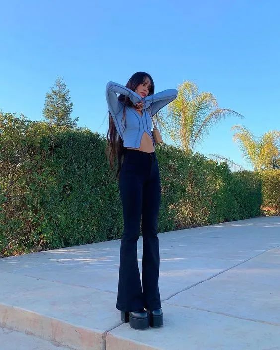Crop top短上衣搭配高腰喇叭裤,这两款单品加起来就是双倍的显高!