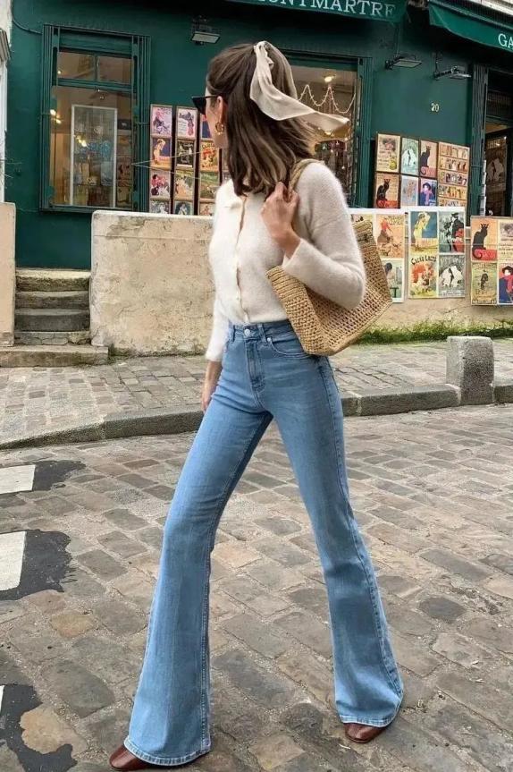 喇叭裤特别适合小腿粗、小腿不好看的姐妹,直接修饰腿型。