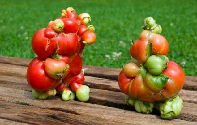 下面这两颗都是草莓。右边是正常草莓,而左边的草莓则是经过核辐射后变异的草莓