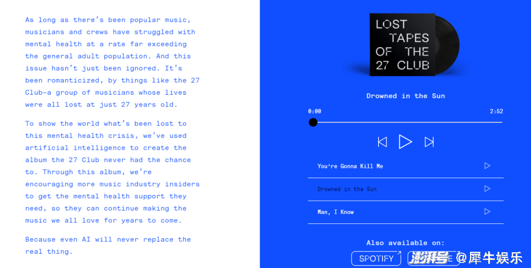 此次发布的《Lost Tapes of the 27 Club》专辑,经过了一年的算法优化和半年的录音、制作。Over the Bridge董事会成员Sean O'Connor对外媒介绍,该项目主要基于Google的AI作曲工具Magenta,从每位音乐人的20到30首歌曲提取音乐元素。
