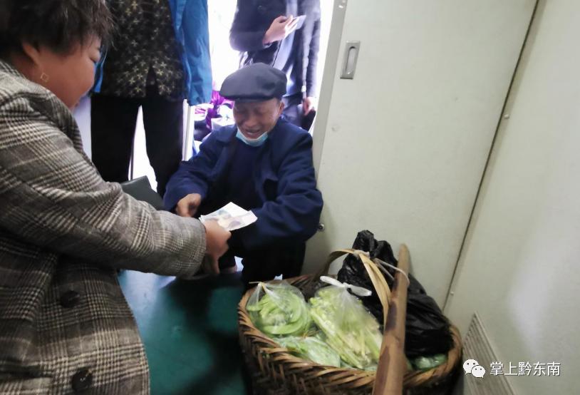 家住黄平谷陇镇的龙爷爷今年75岁了,如往常一样,他挑着自家种的蔬菜,地里挖的螺蛳、竹笋坐上了5639/40列车,刚上车不久,就有人过来询价买菜了,开张生意就卖了20元,他高兴得合不拢嘴:“我坐这趟车卖菜已经有五六年了,车上经常有人跟我买菜,我都习惯了。”