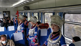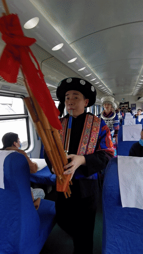 列车上的文艺演出小分队伴随着悠扬的芦笙和银饰的脆响,身着苗族盛装的阿哥阿妹们出现在了车厢里,为乘客带来了欢快的歌舞,他们就是——黔东南州演艺集团有限责任公司组建的绿皮火车文工队。