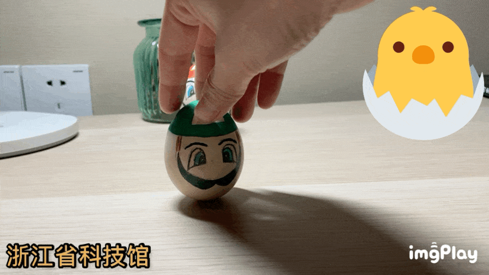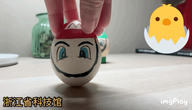 “马里奥”号鸡蛋,就是我们的熟鸡蛋。煮熟的鸡蛋已经成为一个整体,能够整体转动,也能立起来;