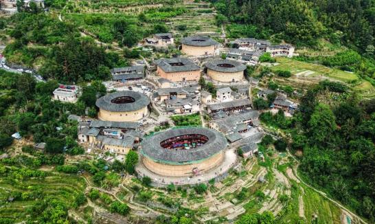 △各色土楼星罗棋布的云水谣古镇。/图虫而南靖田螺坑村,更是在土楼外形上把想象力发挥到了极致。在这个黄姓客家人聚集的小村落里,站在环山的山腰处,你可以看到依据五行排列、三圆一方一椭圆的五座土楼。