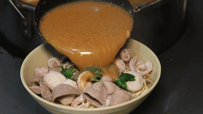 在这里,普普通通的碱水面条加入一勺用猪肉、海味熬煮勾芡的汤汁,再配上卤肠、炸肉、鱼丸等豪华配料,就成了一口入魂、宴席上永不缺席的卤面。