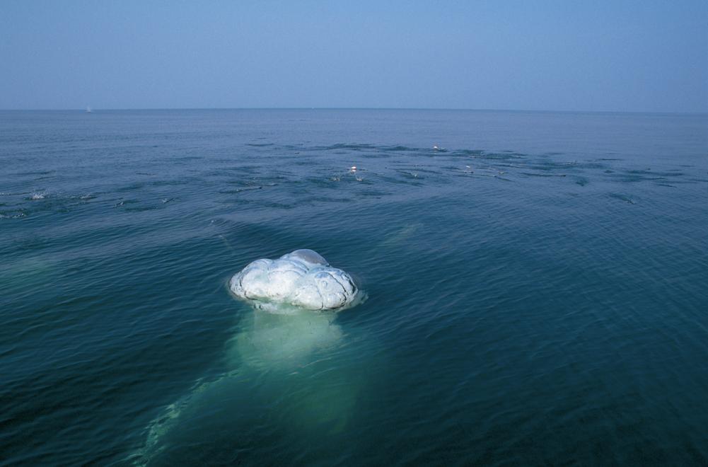 星野道夫一行人来到阿拉斯加东南部的海上,追寻座头鲸的踪迹。突然海面上出现了巨大的气泡圈,无数鲱鱼一齐飞上天空,六头鲸鱼也张开大嘴一跃而起,这就是鲸鱼的神奇捕食行为——即“气幕捕鱼”。就在这时,一头鲸鱼跳出了我们眼前的海面。巨大的身躯飞上半空,静止片刻,又沿原路落下,把海面生生炸开了。那画面是如此震撼,仿佛电影中的慢动作镜头。不一会儿,大海重归平静,鲸鱼继续强有力地游动,仿佛什么都没有发生过。这种行为被称为“鲸跃”(breaching),我见过好几次,却从没有这么近距离地观察过。人类总想要“解释”动物的每种行为,但我们到头来还是无法理解鲸鱼到底想通过这种行为表达什么吧。它也许只是想感受一下海面的风,也许只是想随便跳起来试试看罢了。
