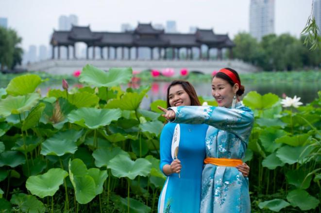 △2019年沙湖公园荷花节期间,市民与荷花合影2021年6月,沙湖公园一年一度的荷花节盛宴将如约而至。以荷为媒,开展的斗荷擂台赛、荷花自然课、荷花展等一系列文化、科普、创意活动,将为市民欢度夏日营造独特的生活场景。