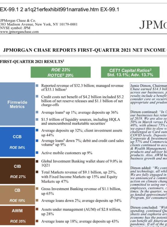 据财报,摩根大通2021年第一季度实现营收331.2亿美元,预期为305.2亿美元,去年同期为301亿美元;实现净利润143亿美元,去年同期28.65亿美元,同比增长399%;实现每股盈利4.5美元,市场预期盈利3.06美元,去年同期0.78美元。