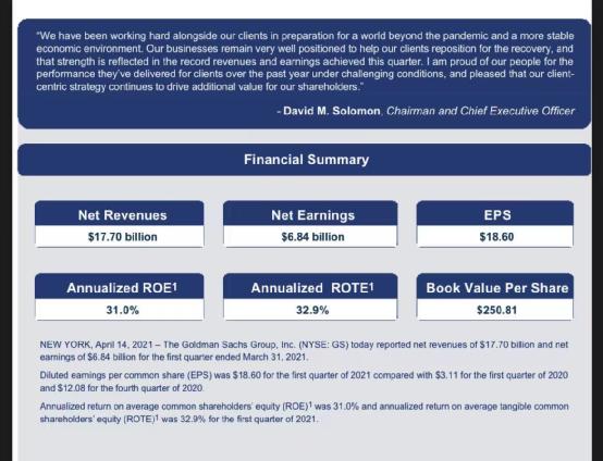 高盛2021年第一财季实现营收177亿美元,创下历史纪录,市场预期为126亿美元;实现净利润68.36亿美元,去年同期为11.23亿美元,同比增长508%;实现摊薄每股收益为18.60美元,市场预期10.22美元。