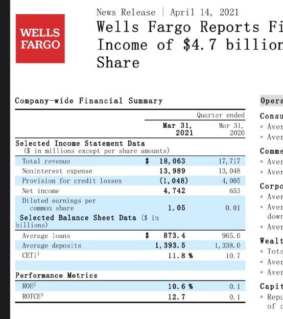 富国银行一季度实现营收180.63亿美元,同比增长2%;实现净利润47.42亿美元,同比增长626%;摊薄后每股收益1.05美元,而去年同期为0.01美元。