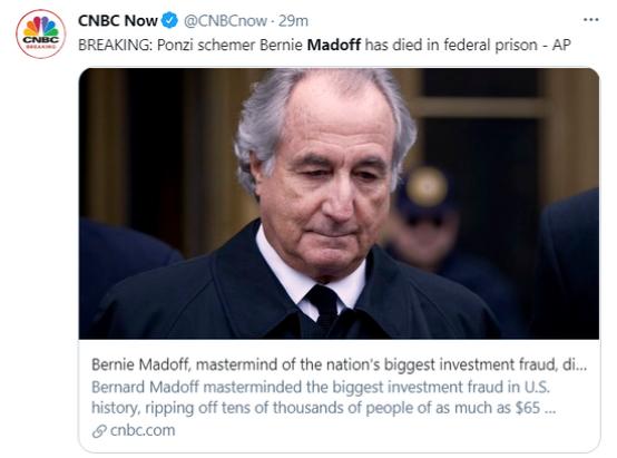 据环球网,14日,美联社等美媒报道,消息人士透露,美国史上最大庞氏骗局的主犯伯纳德·麦道夫在狱中死亡,终年82岁。