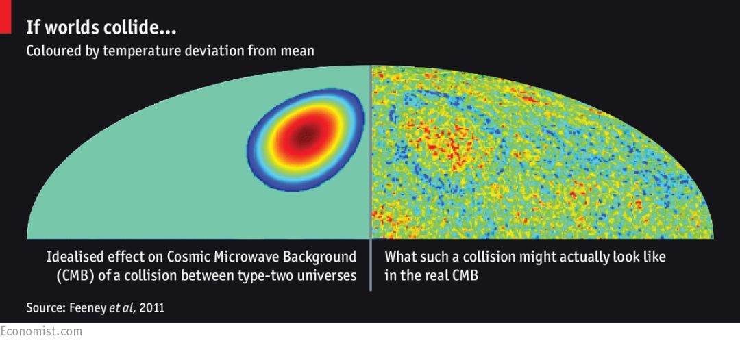 如左图所示,如果宇宙和其他宇宙存在碰撞,则宇宙背景图上应该有一个明显的碰撞痕迹。有科学家宣称在宇宙背景图上真的找到了这个痕迹,如右图,你发现了吗?(图片来源:google)