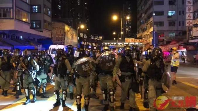 2019年9月,大批持盾牌的防暴警察,沿弥敦道向旺角推进,驱散暴徒。图源:港媒