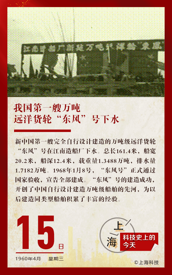 1960年4月15日,我国第一艘自行研究、设计、建造的万吨级远洋船——“东风”号在江南造船厂下水。