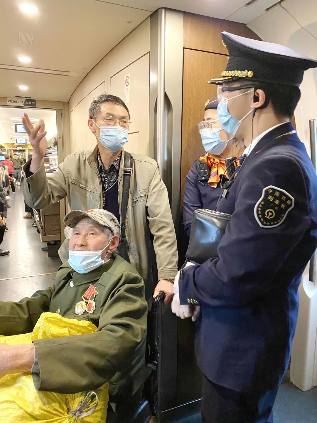 4月8日15时55分,G6003次列车从长沙南站开出后,长沙客运段高铁动一车队G116组值乘人员发现9号车厢有一位身穿军装的高龄重点旅客。