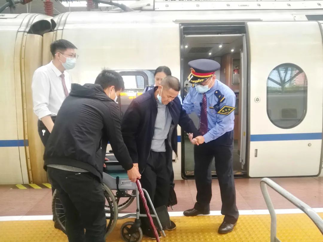 衡阳东站到了,临下车前,徐老紧握着李振的手说:“高铁的服务名不虚传!谢谢你们。”李振帮忙搀扶老人坐上轮椅,他充满敬意地说:“您是我们的英雄!感谢您给我们上了一堂生动的党史教育课!”