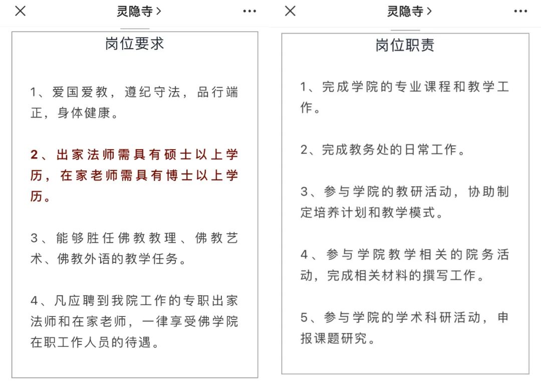 3月24日,灵隐寺公众号发布了杭州佛学院的一则招聘需求:向海内外,常年招聘高素质的教学法师和在家老师。