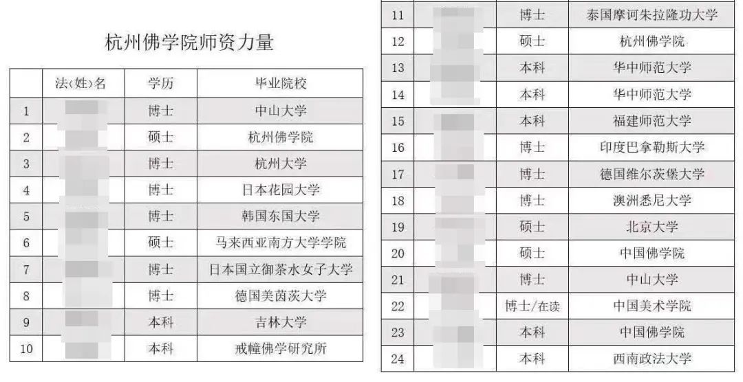 杭州佛学院教理院公布的师资力量,一共24人,本科为7人,硕士为5人,博士达到了12人。而且有不少来自诸如北京大学、中山大学等国内一流大学和海外知名院校。