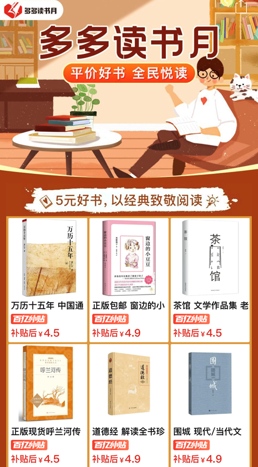 业内人士指出,这是拼多多迄今开展的最大规模“知识普惠行动”。“在过去的一年中,图书行业电商渗透率已接近60%,但仍有大量新兴阅读群体的需求未被充分满足。”“多多读书月”负责人表示,此次活动不设满减、发券门槛,不用比价,直接补贴,以进一步降低阅读门槛,推动知识普惠,让更多“拼书人”切实享受阅读的快乐。此外,在“多多读书月”期间,平台将持续联合各大出版社,不断更新补贴书目,同时协调物流保障等,为广大读者提供优质的服务。