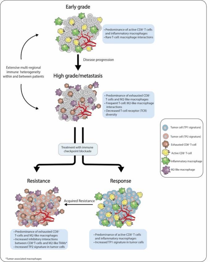图1:ccRCC进展及治疗抵抗相关的免疫微环境变化。低级别ccRCC以富含促炎M1型肿瘤相关巨嗜细胞(tumor-associated macrophages, TAM)和具有正常功能的CD8+T细胞群体为主要特征。而高级别及转移性的肿瘤中显示出抑炎M2型TAM及耗竭性CD8+T细胞的富集。ccRCC的肿瘤具有高度异质性,单个肿瘤组织中同时具有局灶性的高级别及低级别区域。经免疫检查点阻断剂(immune checkpoint blockade, ICB)治疗后,治疗响应的患者肿瘤中促炎TAM、功能性CD8+T细胞以及具有TP1基因表达特征的肿瘤细胞有所增加,而治疗抵抗患者来源的肿瘤中富集了抑炎M2型巨噬细胞、耗竭性CD8+T细胞及TP2基因表达特征的肿瘤细胞。治疗响应者体内的促炎TAM及功能性CD8+T细胞也同时上调了与免疫逃逸相关的基因,为最终发生治疗抵抗提供了一条途径。综上所述,这些研究揭示了构成复杂TME的细胞异质性、可塑性及互作性,同时确定了共通的线索:每项研究都报道了耗竭性或功能失调的CD8+T细胞及抗炎的M2型TAM与肿瘤进展及ICB治疗抵抗相关,而且具有正常功能的CD8+T细胞及促炎型TAM与肿瘤转归及ICB响应相关。这些研究在强化已知主题的同时,也揭示了细胞状态的连续变化,并鉴别出新的可能影响肿瘤整体免疫“温度”的基因特征及分子靶标。这些研究主要局限于采用体量相对较小的患者队列来生成这些特征。尽管这些被鉴定出的特征的预后及预测价值已在多个外部队列中得到验证,仍需进一步的研究工作来确定患者共有的治疗靶标,或可解决现有治疗方法耐受的问题。此外,进一步分析其他尚未被充分研究的免疫细胞类型——例如肿瘤内抗原提呈部位的细胞——的研究,将对鉴定新型治疗靶点从而解决ccRCC免疫功能障碍这一问题至关重要(Jansen et al., 2019)。