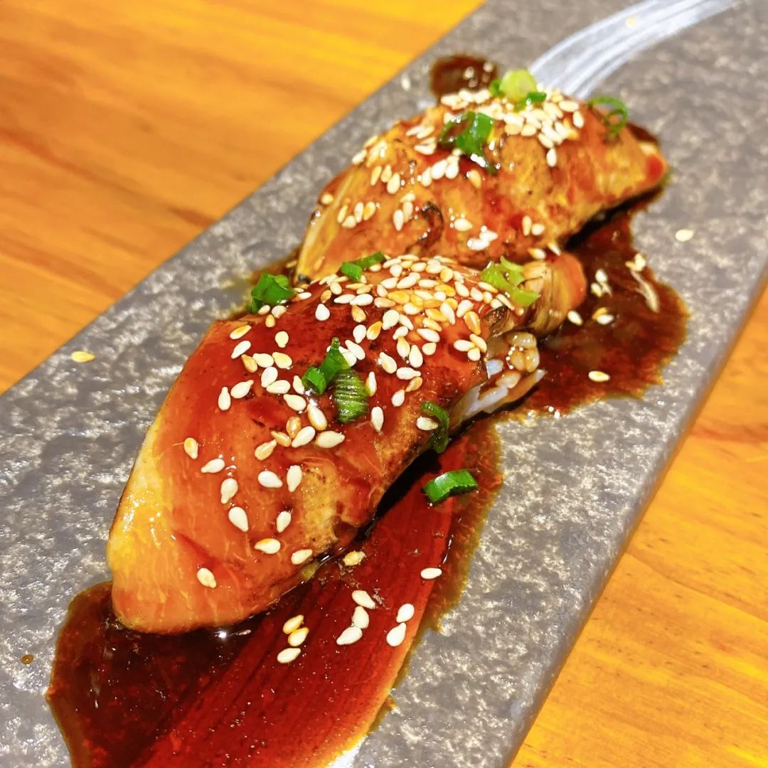 十里鳍是我慕名而来的一家店,铁板厚烧牛舌、芝士焗土豆泥、鳗鱼饭等推荐菜都可圈可点,但是最惊艳的一定是鹅肝手握,让我念念不忘。肥美的鹅肝切得大小和厚度都刚刚好,炙烤到表面微微焦脆,极香油脂渗入到酸甜的米饭中,浇上特制酱汁,撒上白芝麻和葱花,整个塞进嘴里,一瞬间将口腔填满,然后所有味道一起触发,浓香、细腻、柔软,酸甜咸香样样具备,整个世界都被点亮!