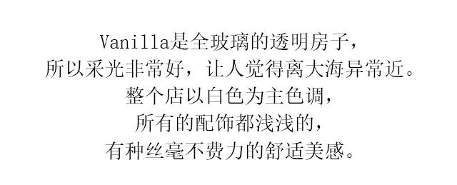 极地海洋世界附近有很多临海的咖啡厅,每家店的窗外都是大海,根据店铺风格与装潢的不同各有各的美。我最常去是Vanillacafe。因为是全玻璃的透明房子,Vanilla的采光非常好,让人觉得离大海异常近。整个店以白色为主色调,所有的配饰都浅浅的,有种丝毫不费力的舒适美感。