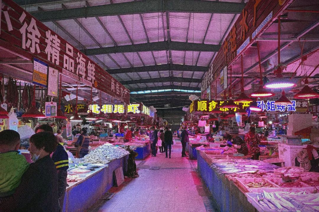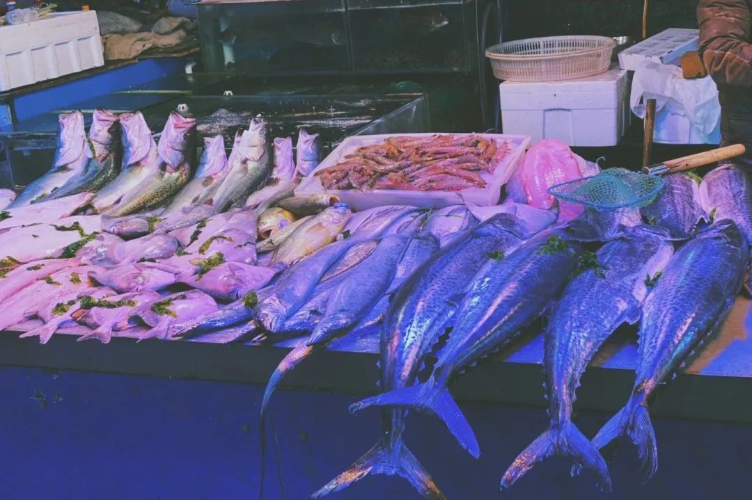 青岛市埠西市场,灯光颇有赛博朋克的味道。©微博:是子夏小朋友呀梭子蟹、红岛蛤蜊、本地刀鱼、海捕鲳鱼、日照海蛎子、青岛蛎虾……本地人总知道哪里的海鲜是最肥美的,同样是海蛎子,不同的产区味道就千差万别。