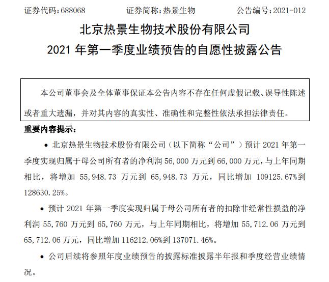 热景生物近日持续大涨,一个重要因素是公司一季度净利大幅增长。4月12日晚间,公司披露2021年一季度业绩预告,预计第一季度实现归母净利润5.6亿元到6.6亿元,与上年同期相比将增加5.59亿元到6.59亿元,同比增长109125.67%到128630.25%,亦即增长超过1000倍,这样的增幅,使得公司暂时锁定A股一季报“预增王”。