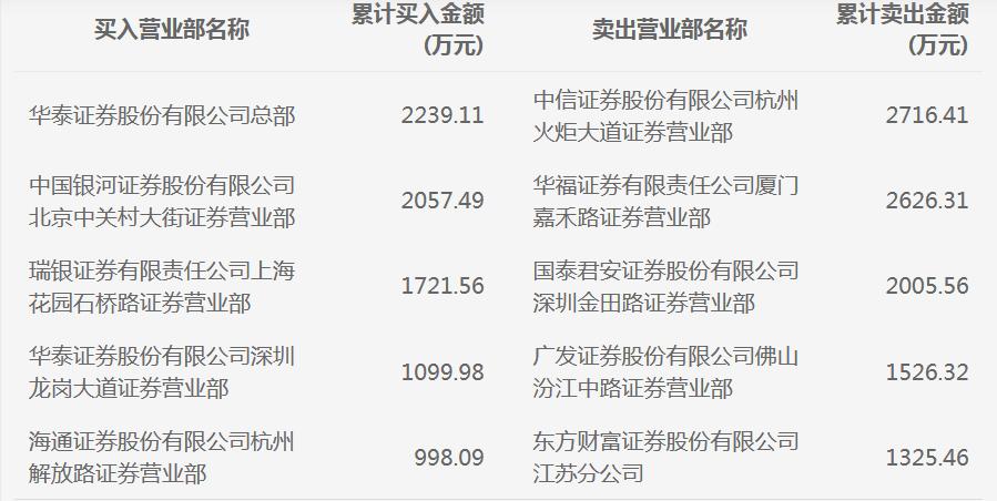 4月14日,该股买入前两席位为华泰证券上海静安区威海路证券营业部和华福证券厦门嘉禾路证券营业部、分别买入2617万元、2424万元,买入第三则为机构席位,买入2356万元;当日卖出居首的则为国泰君安深圳金田路证券营业部,当日共卖出4986万元。