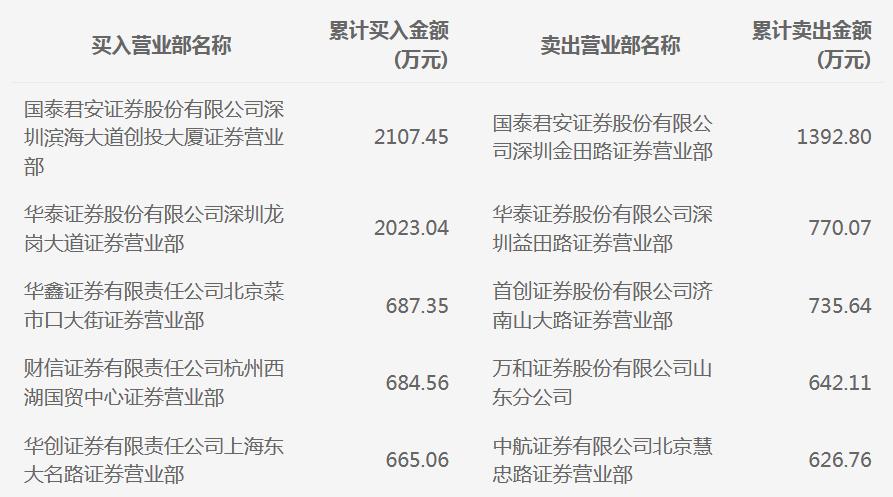 4月13日,买入前两席位则为国泰君安深圳滨海大道创投大厦证券营业部、华泰证券深圳龙岗大道证券营业部,分别买入2107万元、2023万元,国泰君安深圳金田路证券营业部则卖出约1393万元。