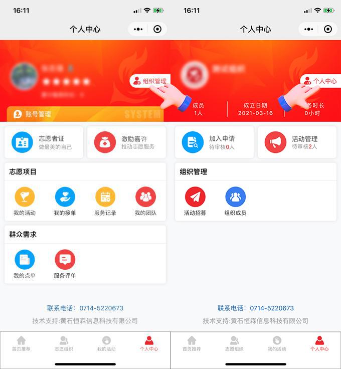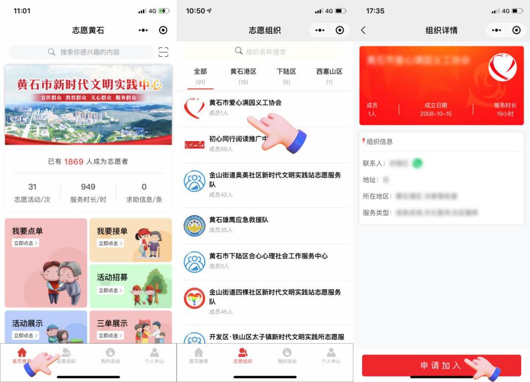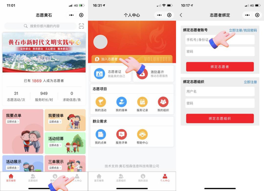 点击右下角进入个人中心,点击"加入志愿者",点击进行志愿组织注册。