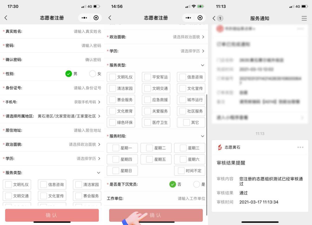 填写注册表单点击提交,打开消息提醒开关等候审核通知,当后台审核通过后,会向用户微信发送提醒消息。