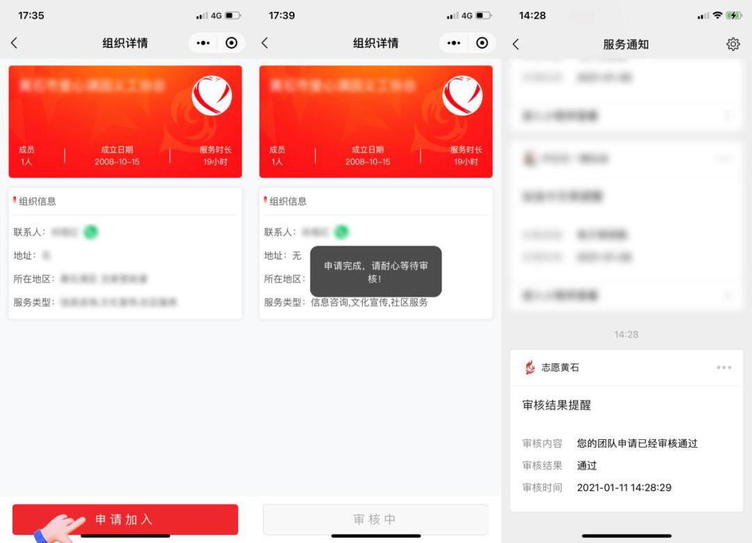 1、查看组织介绍点击进入组织详情,查看所在区域、服务类型、组织历程等。点击申请加入,等待后台审核。后台审核通过后会向用户微信发送提醒消息。